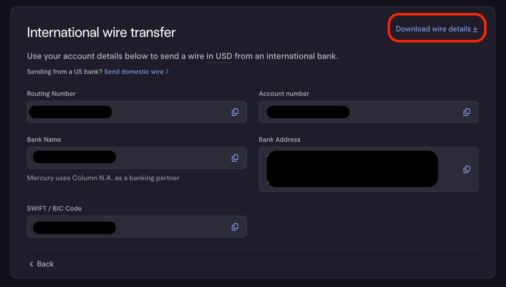 不同銀行的驗證流程可能不同,實際匯款前仍建議以 Mercury 官方提供的 wire details 為準。